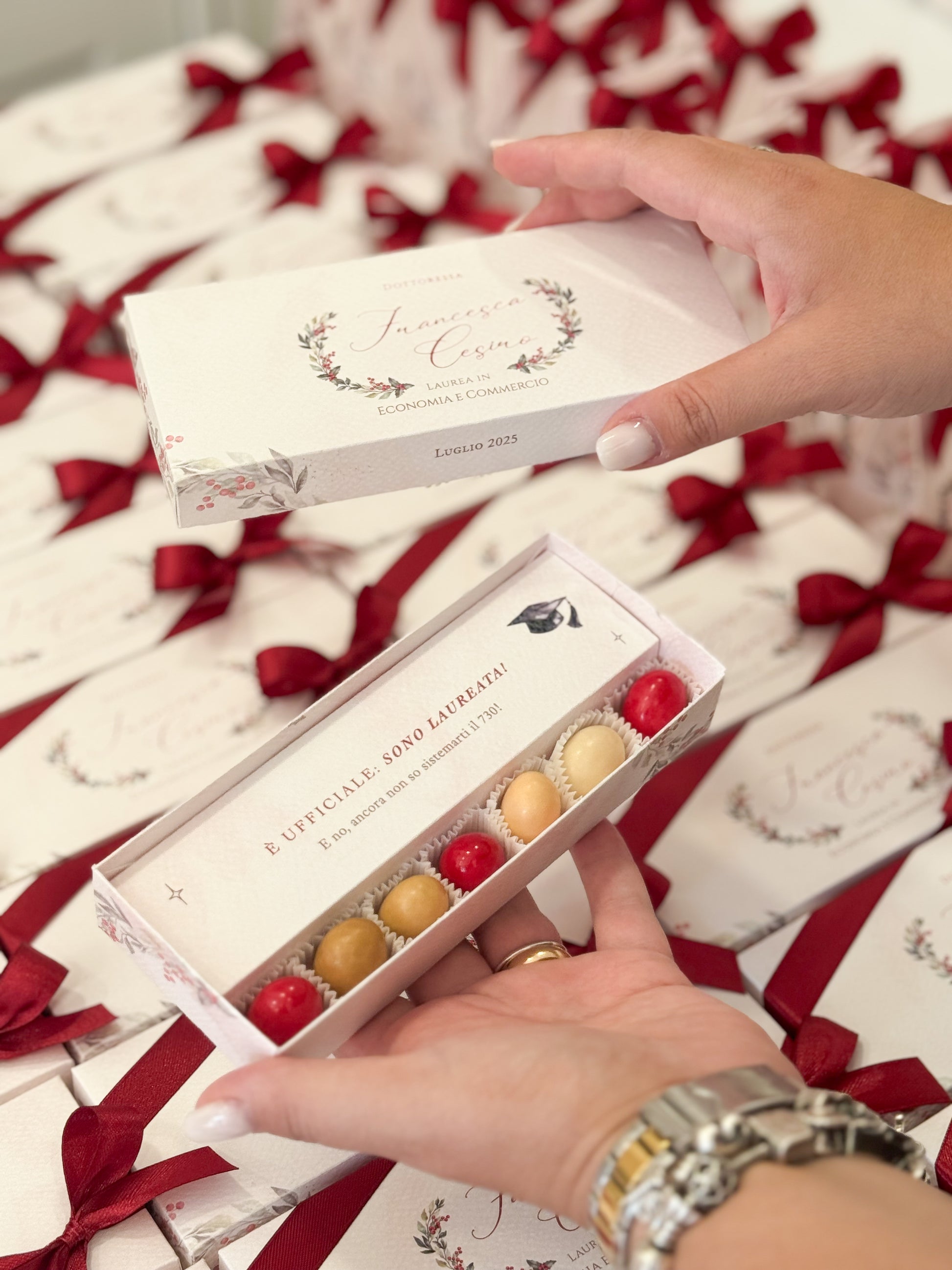 Comprende 7 confetti degustazione in appositi pirottini e divisore personalizzato oppure in alternativa 14 confetti degustazione e divisore più piccolo al centro.