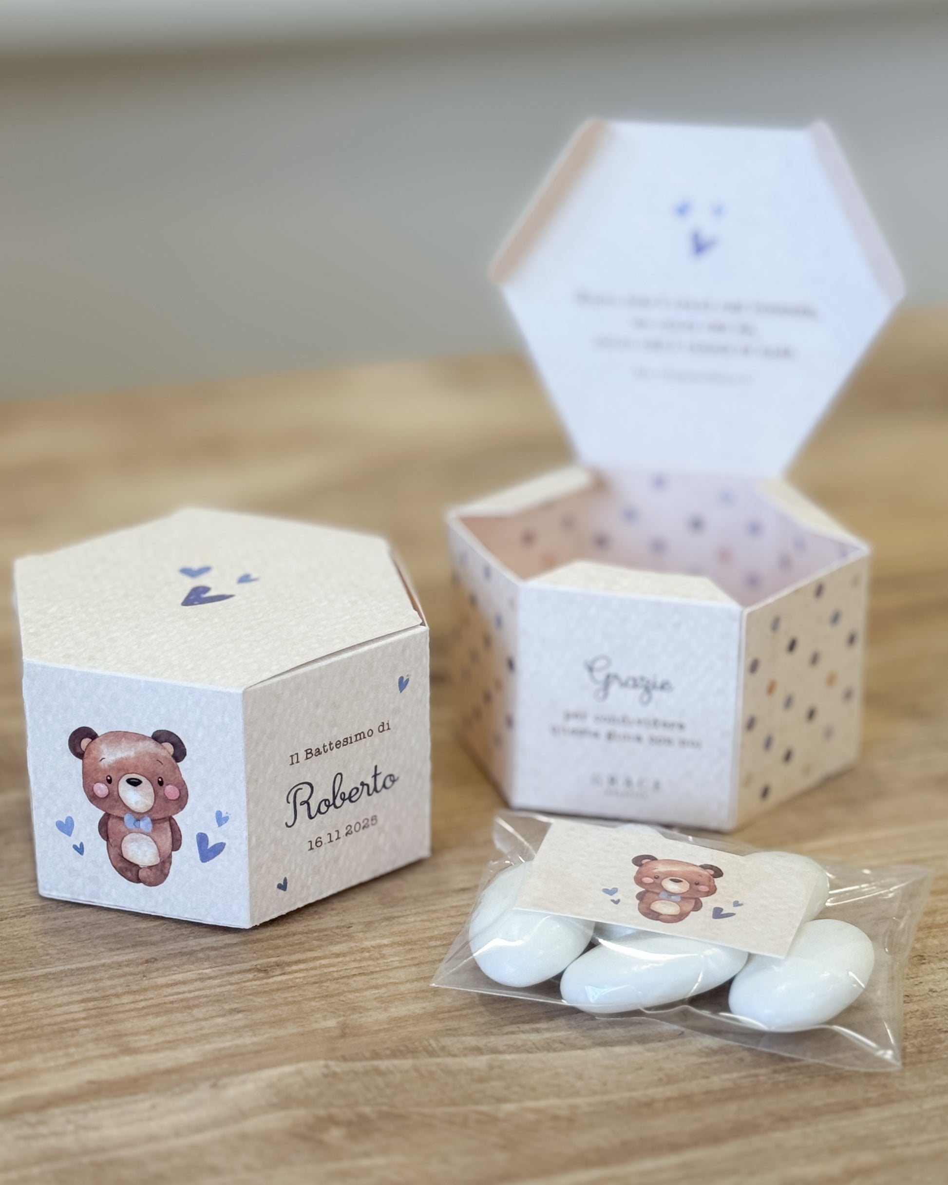 All'interno è previsto l'inserimento dei confetti in una bustina trasparente e bigliettino bomboniera abbinato in regalo, o in alternativa vuota.