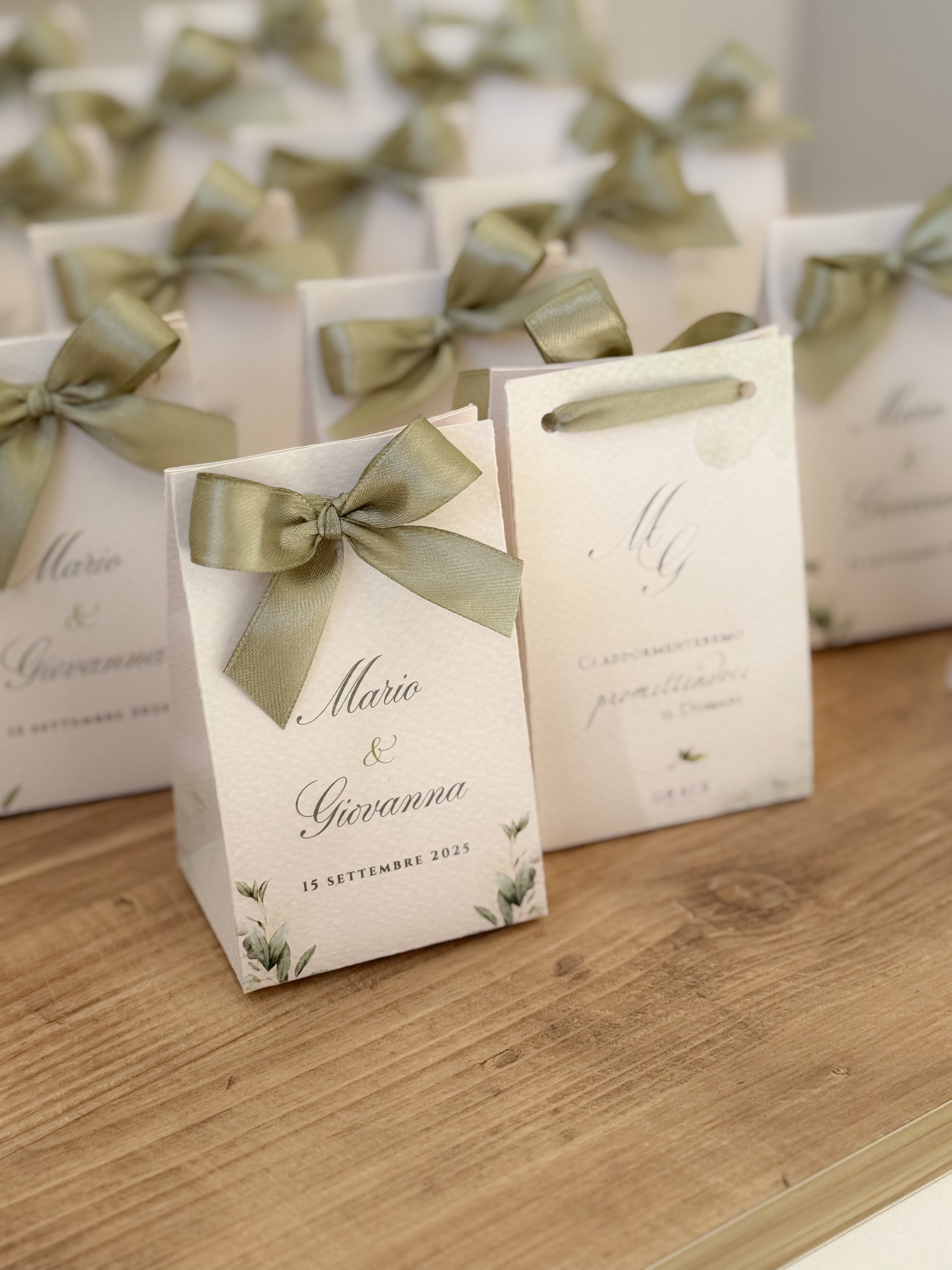 All'interno è previsto l'inserimento dei confetti in una bustina trasparente al gusto cioccolato e bigliettino bomboniera abbinato in regalo.